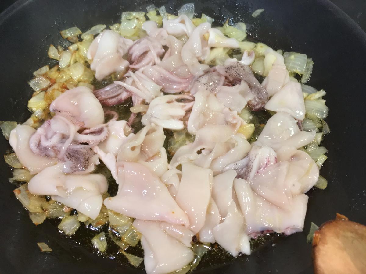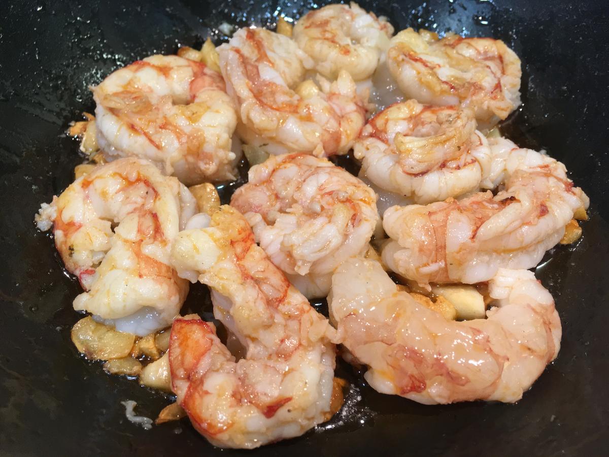 Sofreír el ajo cortado en láminas y hacer los gambones ( vuelta y vuelta), reservar