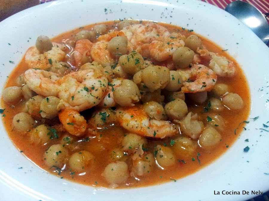 Se pone en la olla los garbanzos , la cebolla, la zanahoria, el pimiento, ajo, perejil, sal, el pimentón, se echa el agua de cocer los langostinos, colado.