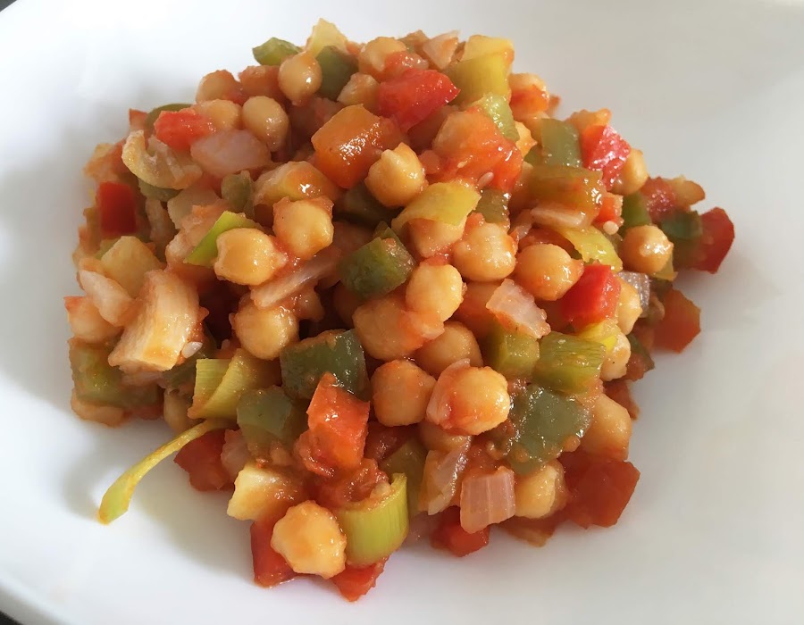 - Cuando estén en su punto, añade los garbanzos y rehoga todo junto cinco minutos más, removiendo continuamente para que se mezclen bien los ingredientes.