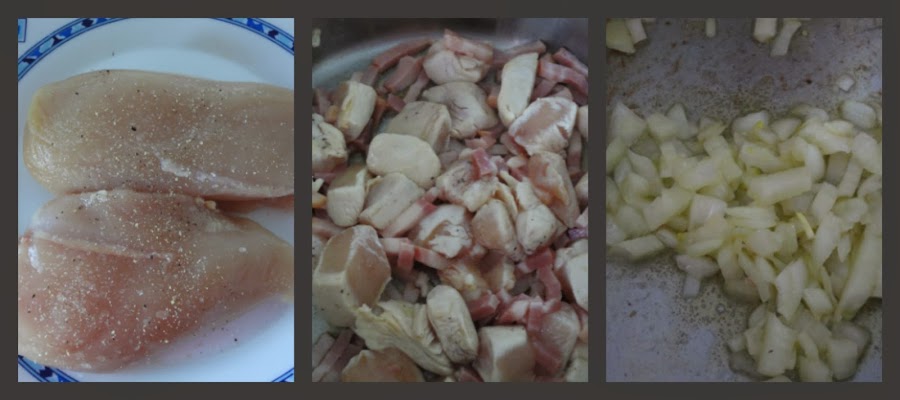 En una cazuela,a ponemos 4 cucharadas de aceite y sofreímos las pechugas y el bacon. Dejamos hasta que los trozos de pollo comiencen a dorarse. Retiramos y reservamos.