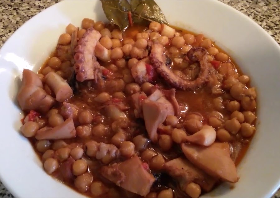 Este guiso de garbanzo con pulpo es un plato muy energetico y rico por su alto contenido en vitaminas y minerales.Su elaboración consiste simplemente en picar bien todas las verduras y agregar bien sus condimentos......en el video vereis exactamente que hacer,que lo disfruteis.