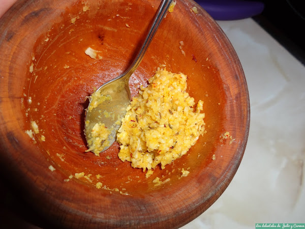 Vamos a preparar el majado, machacando en el mortero los ajos, junto con unas hebras de azafrán (la cantidad depende de cada uno y de lo que os guste su sabor, pero con unas 5-7 creemos serán suficientes), las almendras tostadas y los cominos.