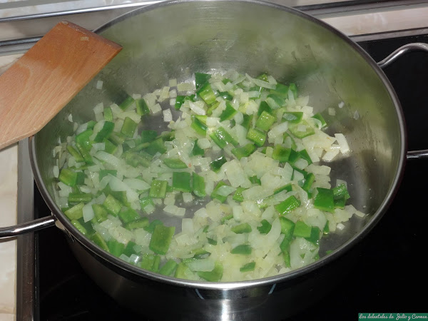 En la misma olla que teníamos, vamos a pochar la cebolla a fuego medio-bajo. Cuando comience a dorarse, verteremos el pimiento, y removemos, salando ligeramente.
