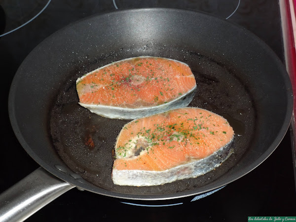 Espolvoreamos los filetes de salmón con ajo en polvo y perejil y los cocinamos a la plancha hasta que veamos que están listos. Una vez fuera, los dejamos que se enfríen un poco y quitaremos la piel y las espinas, dejando trozos mas o menos grandes y limpios. Reservamos.