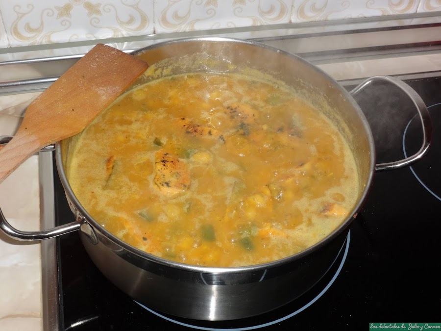 Cuando rompa a hervir, echaremos el majado y removemos para distribuirlo bien. Probamos para rectificar de sal y echamos un poquito de colorante para dar color, y lo mantenemos cocinando unos 30 minutos (para que el caldo reduzca), ya que los garbanzos ya estaban cocidos y no es necesario mas tiempo.