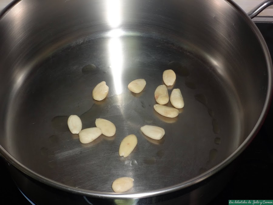 En una olla con una gota de aceite, tostaremos las almendras. Cuando comiencen a tostarse un poco, las sacamos y dejamos enfriar.