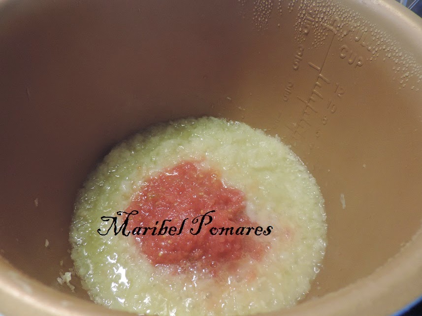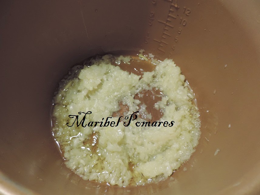Echamos el aceite de oliva, cebolla y ajo picados en la cubeta de la olla.