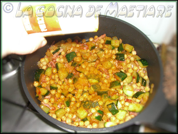 Cuando el calabacín esté a medio cocinar añadir el bacón ahumado.