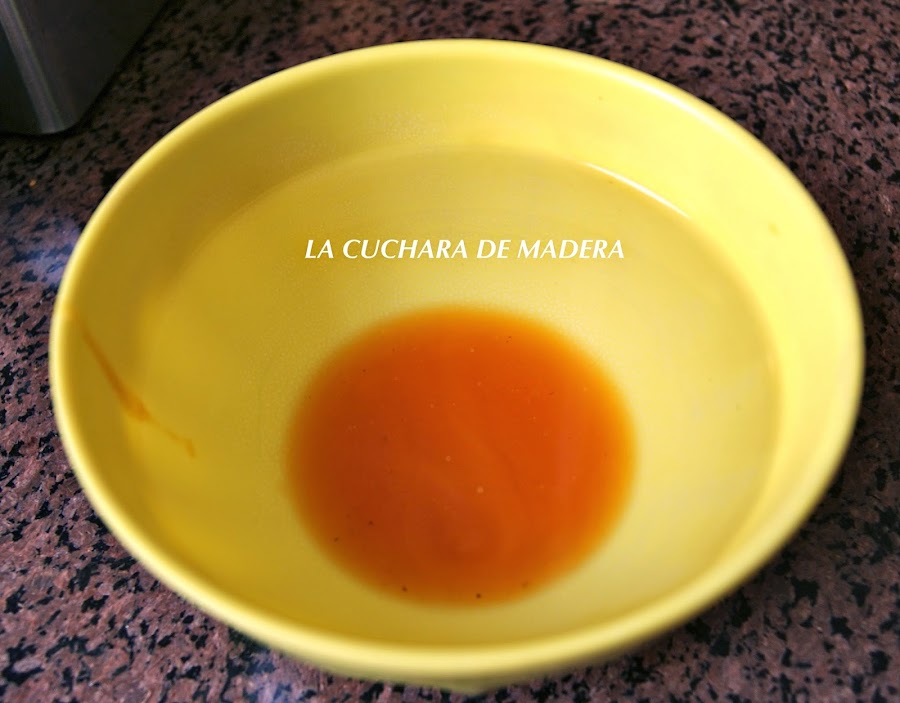 En un bol con agua añadimos dos cucharas grandes de miel, la que usamos se trae de la finca y su sabor es muy bueno, miel pura de abejas. Lo agregamos a la sartén
