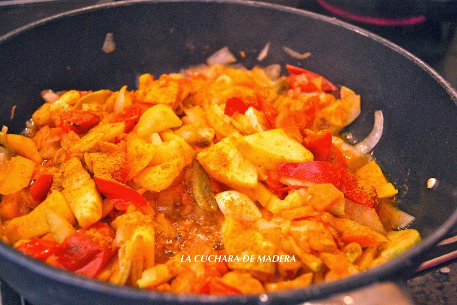Agregamos el curry, nosotros le pusimos una cuchara grande, esto va al gusto personal.Removemos y dejamos al fuego unos minutos para que coja sabor.