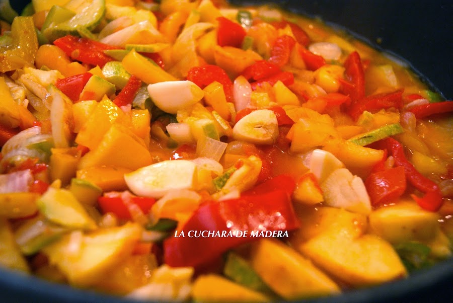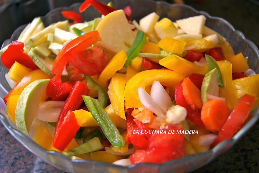 Empezamos lavando todos los pimientos, la manzana sin pelar, los calabacinos y los tomates, pelamos la cebolla y los dientes de ajos; cortamos en trozos medianos