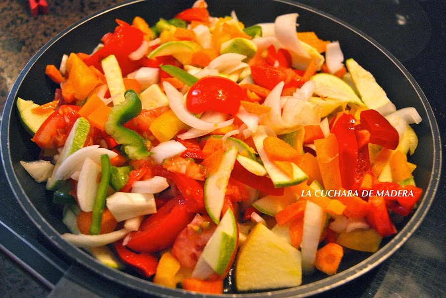 En una sartén con un poco de aceite pondremos todo menos los ajos y dejamos a fuego medio/bajo