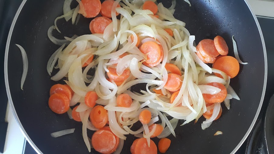 Cuando la cebolla empiece a tomar color añadimos la zanahoria pelada y cortada en rodajas.