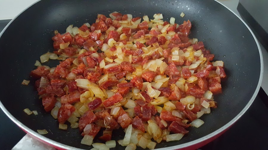 3. - Cuando la cebolla empiece a tomar color, añadimos el chorizo y rehogamos para que suelte un poco de grasa.