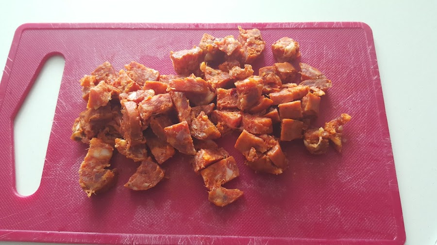 2. - Mientras , pelamos el chorizo y lo troceamos.