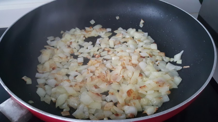 1. - Troceamos la cebolla,a mi me gusta con bastante cebolla, y la ponemos en una sartén amplia, con un poco de aceite a fuego medio.