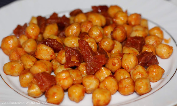 Freímos en un poco de aceite el chorizo y echamos los Garbanzos. Removemos.