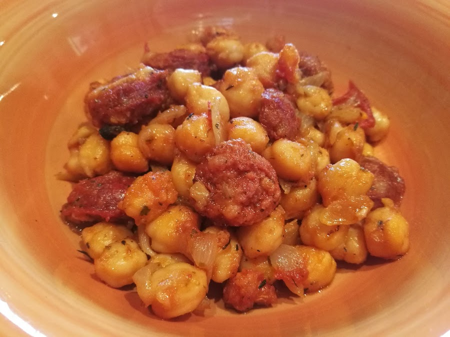 - Añadir los chorizos a rodajas y los garbanzos, hasta dorar.