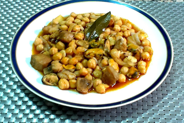 PREPARACIONPoner en una cazuela u olla el aceite de oliva a calentar , picar en juliana la cebolla ajos y pochar , añadir la cola de rape en taquitos sin la raspa central , dar unas vueltas y poner el pimenton , mezclar rapido y agregar el vino , dejar reducir un poco , añadir el laurel y tomate , consumir un poco poner el concentrado de pescado , volcar el bote de garbanzos y mejillones , con el mismo bote de los garbanzos añadir agua hasta cubrir lo justo y hervir a fuego medio hasta que todo este tierno , unos 12-15 minutos ( tiene que quedar una salsita espesa ).......espero os guste.......