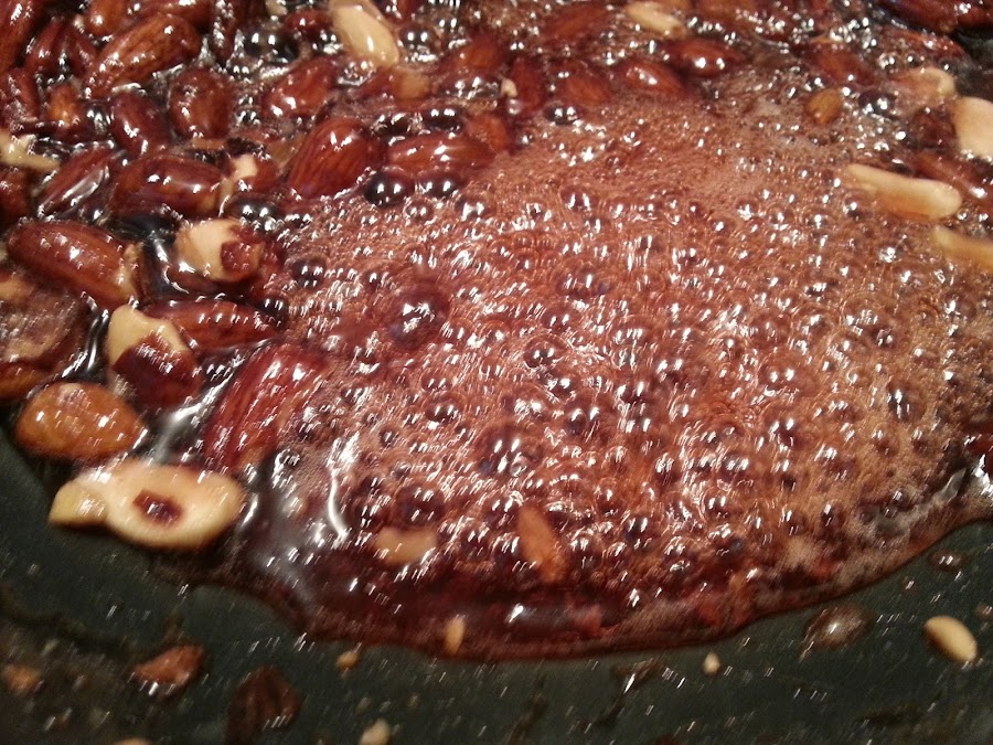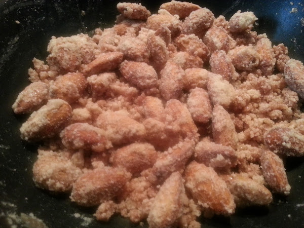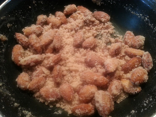 5. - En este momento subimos un poco el fuego,como al principio, y movemos constantemente, para que el azúcar arenosa, vaya poniéndose brillante y se vaya pegando a las almendras.