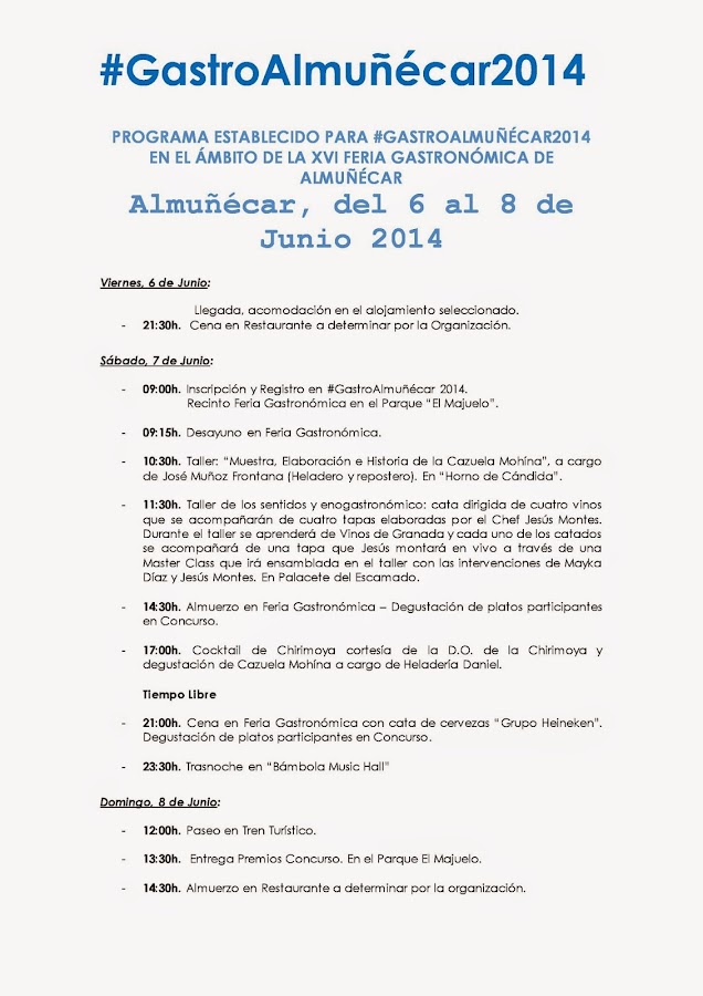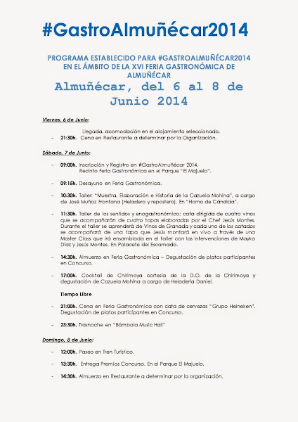 Hoy os traigo una buena noticia de nuevo. En el marco de la XVI Feria Gastronómica de Almuñécar se va a celebrar el II Encuentro de Blogueros gastronómicos, #Gastroalmuñécar2014, los días 6,7 y 8 de junio. El año pasado este encuentro de blogueros lo organizó nuestra amiga Helena, del Valle, aunque este año se encuentra muy ocupada en su negocio y no ha podido hacerlo, por lo que me ha pasado el testigo. Y en colaboración directa con el Área de Turismo del Ayuntamiento de Almuñécar, representada por Rafa Caballero y Felipe Puertas, con José Muñoz, de Heladería Daniel y Maika Díaz de GestionLab, hemos preparado en estas últimas semanas el programa completo de blogueros.
