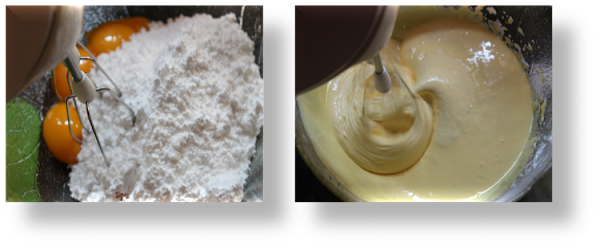 Añade al bol de las yemas una cucharada de clara batida para soltar la masa. A continuación añade una cucharada de almendra molida, integra bien.