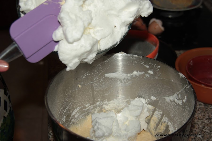 Incorporamos finalmente las claras que previamente habremos montado a punto de nieve junto a la pizca de sal.