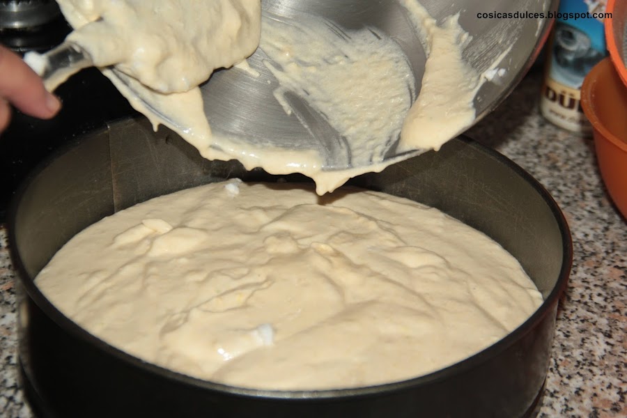 Vertemos la masa en un molde de unos 22 centímetros de diámetro previamente engrasado y horneamos a 180º (con el horno precalentado) unos 40 minutos o hasta que veamos que está listo.