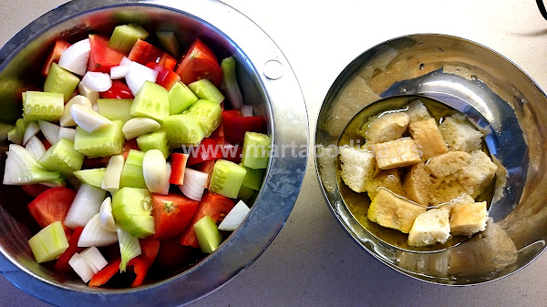 Ponemos el pan en un bol con el agua, el aceite y el vinagre.