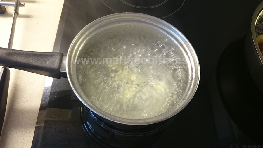 Pelamos los ajos, los partimos por la mitad, y los blanqueamos 3 veces ( blanquear significa sumergir una producto en agua fría, calentar hasta que hierva y sumergirlo luego en agua con hielo)