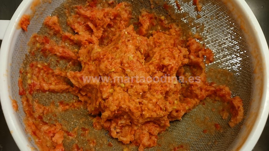 Pasamos el puré por un colador y aplastamos con ayuda de un cucharón, separando así las pieles y las semillas.