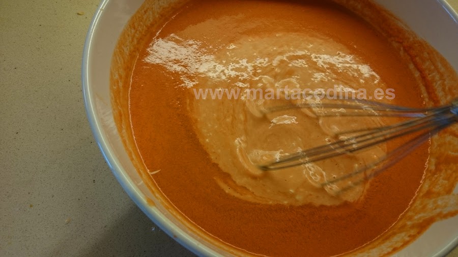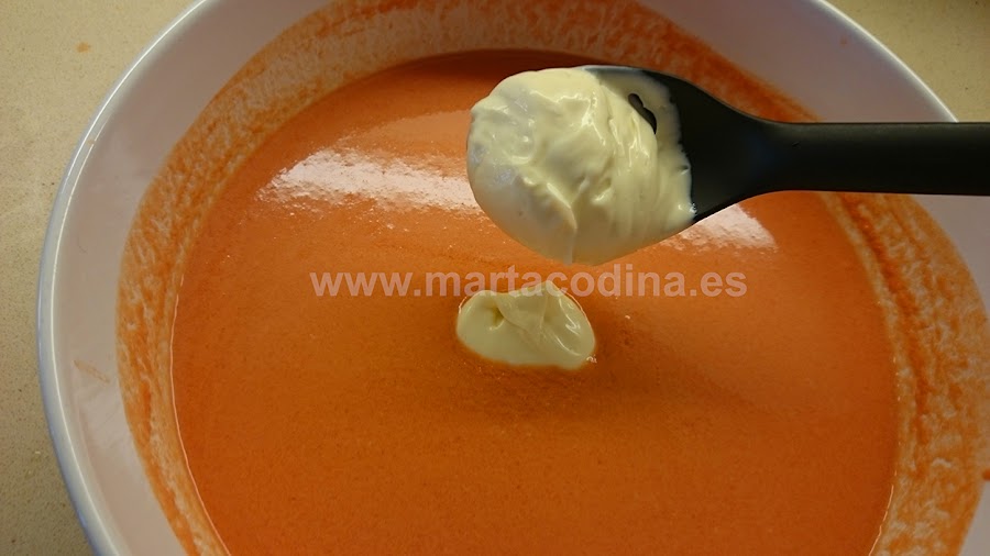 Añadimos 3 cucharadas de mayonesa (en este caso la hice yo pero en verano es mejor comprarla hecha) y mezclamos bien con las varillas