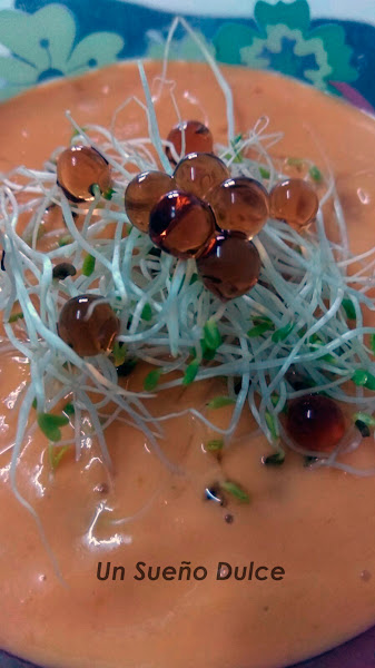 Y es que me ha dado por ponerle unos germinados de alfalfa (con una gran cantidad de nutrientes) y unas perlas de vinagre de Pedro Ximénez que le aporta una sensación "explosiva" y toque muy rico (si os gusta el vinagre, claro...)