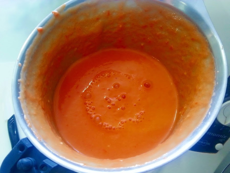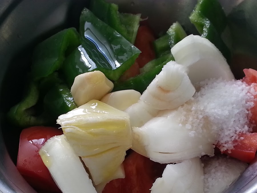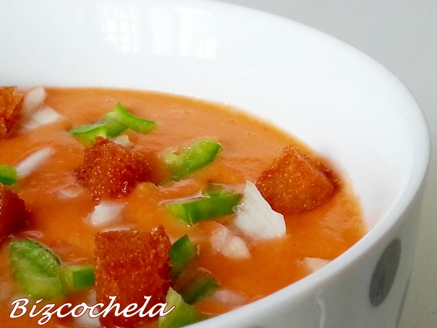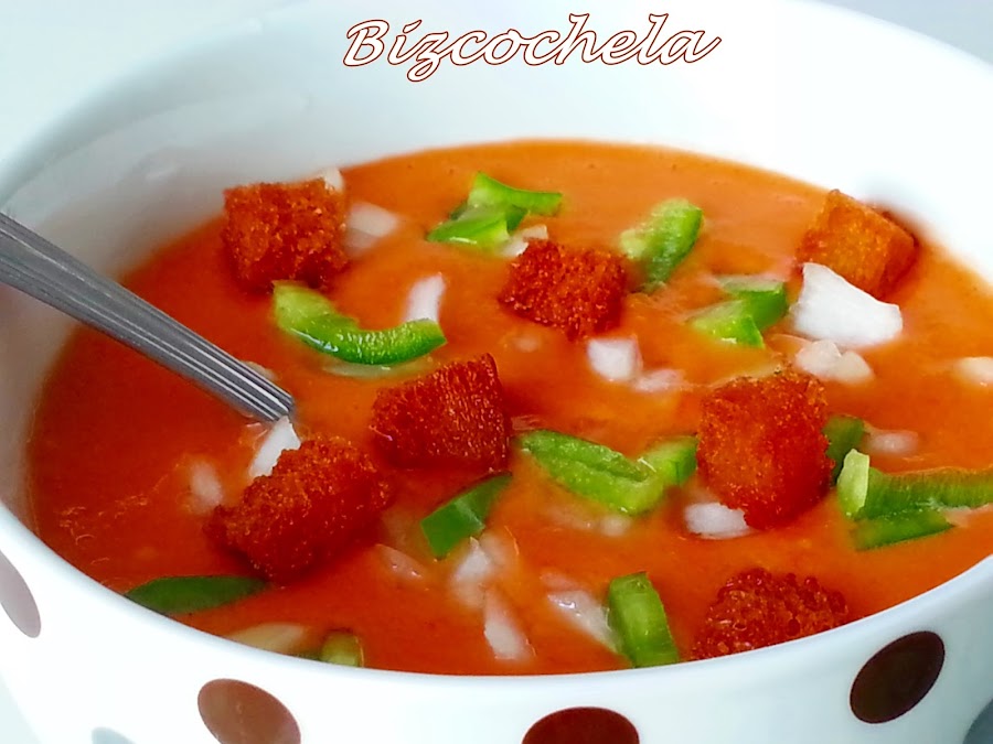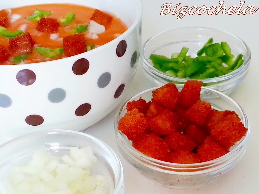 Hay veces que lo hago más líquido, para beberlo como acompañamiento de las comidas, y otras, como en esta ocasión, lo pongo de primer plato acompañado de diferentes ingredientes troceados para hacerlo más contundente.