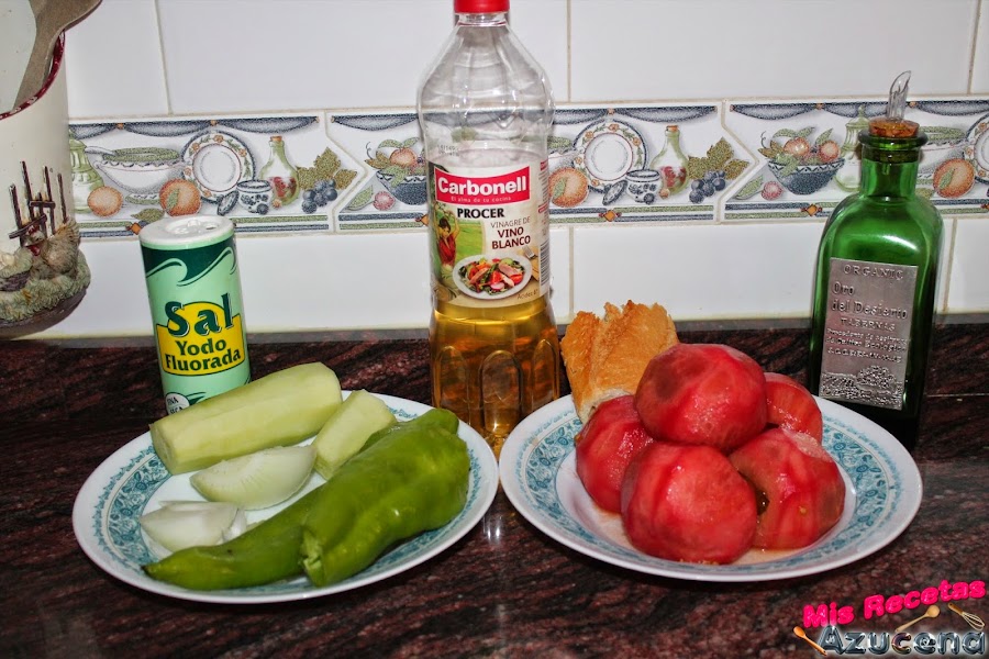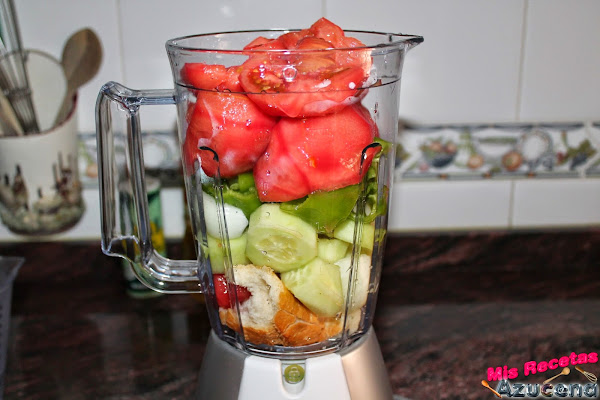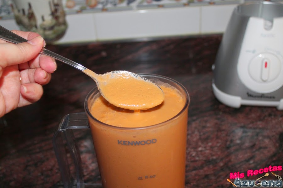 En una batidora americana pondremos todos los ingredientes, una pizca de sal, el pimentón, un chorreón de vinagre y otro de aceite, batiremos bien hasta que se quede como una especie de sopa o crema.