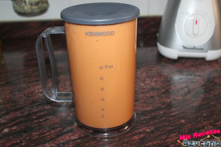 Una vez lo tengamos todo bien batido lo pasaremos a un jarra, taparemos y lo meteremos en la nevera unas horas hasta que se ponga frio.