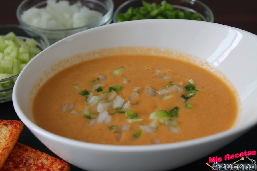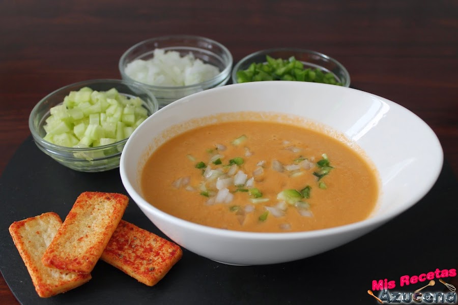 A la hora de servir picaremos un poco de pepino, cebolla y pimientos, en trocitos pequeños y lo ponemos en cuencos diferentes.