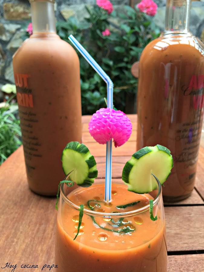 Podéis observar todo el jugo obtenido al reposar toda la noche, que redundará en el sabor. Lo pasamos muy bien con la batidora y después con el pasapurés y rectificamos, si es necesario de sal y/o vinagre. Yo siempre lo guardo en botellas de cristal, que hacen que se conserven en la nevera muy bien. Les pongo unas gotas de aceite en la superficie y las tapo con su tapón, y listo para consumir cuando apetezca. Podéis decorar los vasos o copas con unas rodajas de pepino y unas tiras muy finitas de su piel, y rematar con unas gotitas de aceite en la superficie.