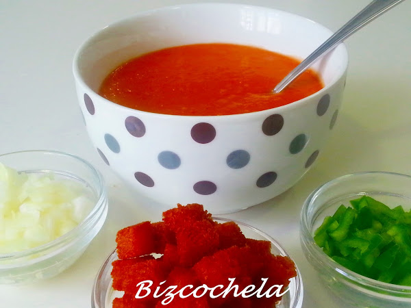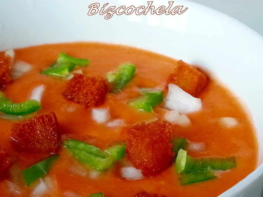 Hay veces que lo hago más líquido, para beberlo como acompañamiento de las comidas, y otras, como en esta ocasión, lo pongo de primer plato acompañado de diferentes ingredientes troceados para hacerlo más contundente.