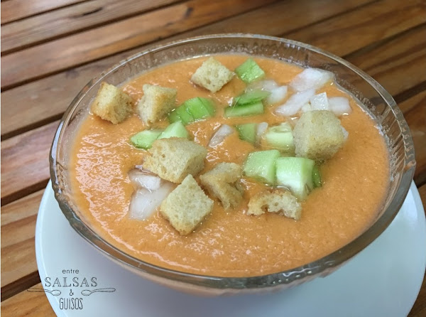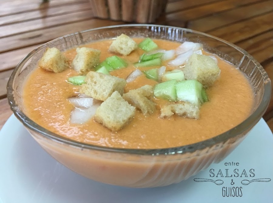 Sírvelo bien fresquito. Si te gusta más espeso puedes añadir más pan, a mi con esta cantidad me va genial.Puedes servirlo con las mismas verduras que has puesto pero cortaditas a taquitos con unos cuantos picatostes, a mi es como más me gusta, pero también puedes poner taquitos de jamón, huevo duro... cada uno a su gusto.
