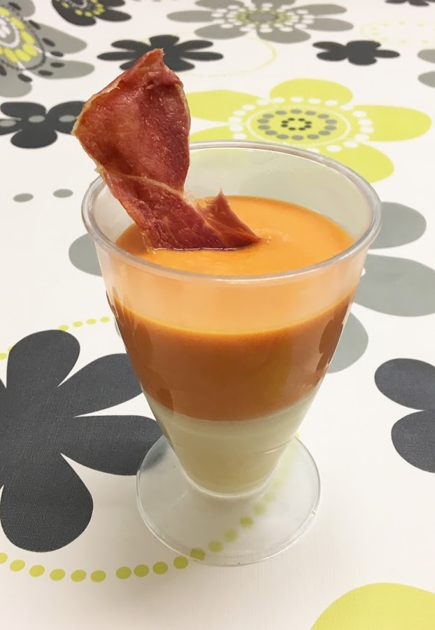 Esta refrescante receta os encantará para combatir los pocos días de calor que nos quedan, la combinación de la crema de queso con el gazpacho está muy rica, y contrasta mucho su suavidad con el crujiente de jamón.