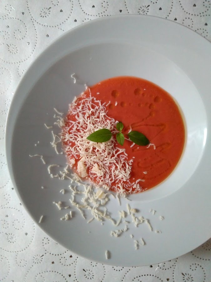 Servir cubriendo el gazpacho con queso rallado y unas gotas de aceite de oliva.