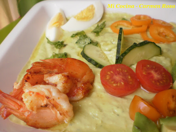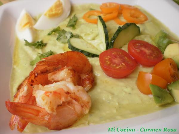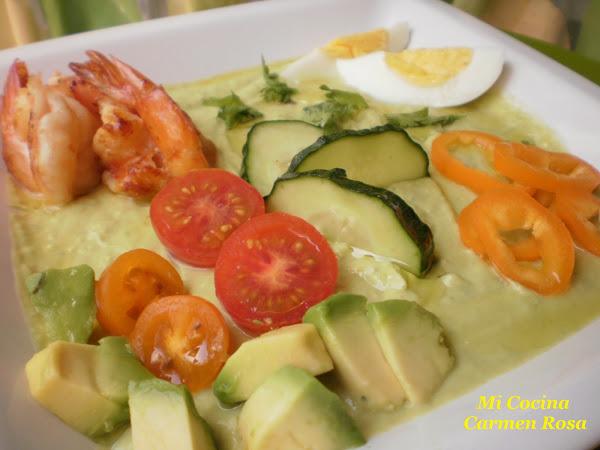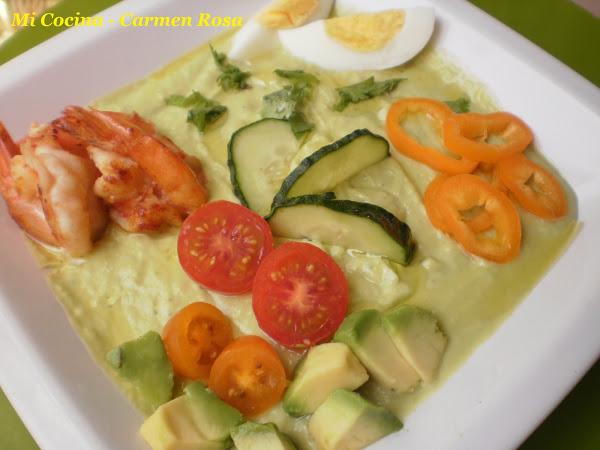 Hoy, he preparado un gazpacho?aunque por su consistencia, más que un gazpacho yo le denominaría "porra" de aguacate y calabacín, al que le he puesto imaginación e ingredientes extras para la guarnición?..receta del gran cocinero Karlos Arguiñano.