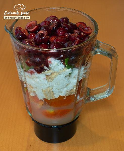 Después de tenerlo todo bien limpito y troceado, introducimos todos los ingredientes sólidos, el vinagre al gusto (yo he puesto 20 ml. pero puedes poner más o menos cantidad, piensa en el dulzor de las cerezas) y el agua (vamos todo excepto el aceite) en una batidora o vaso batidor. Y que no se os olvide ponerla en marcha.