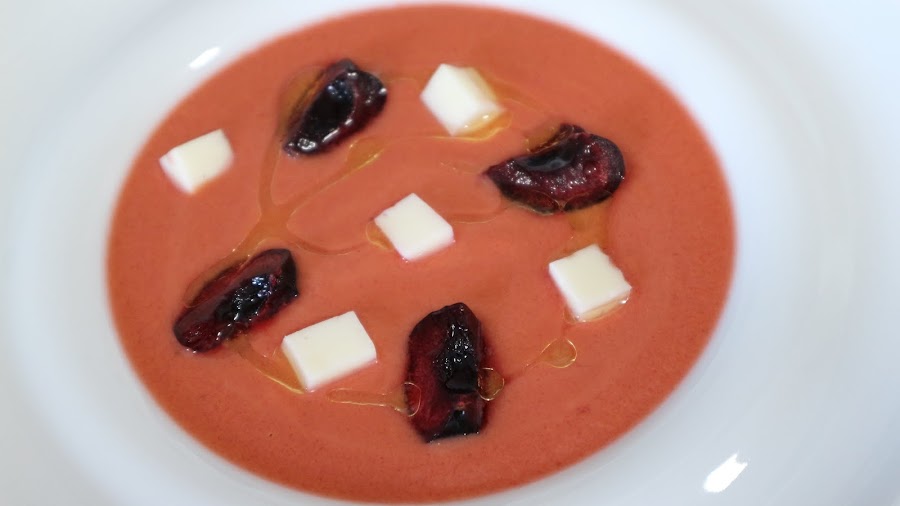 5º Sirve tu gazpacho bien frío y acompañado de una cereza troceada junto con unos dados de queso tierno, es un plato de 10 nosotros lo hemos disfrutado mogollón.
