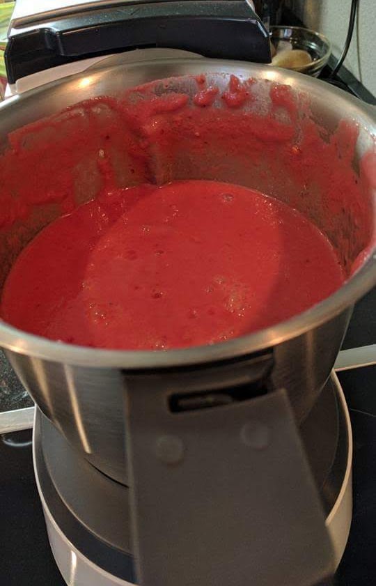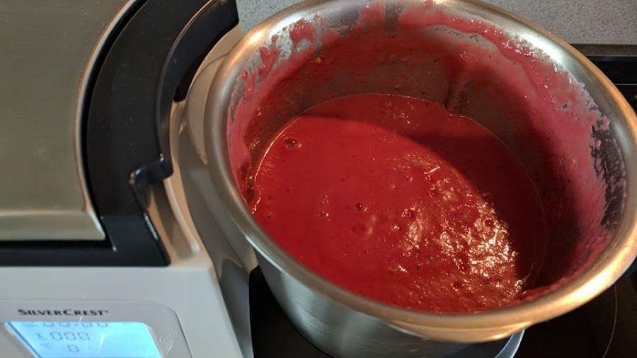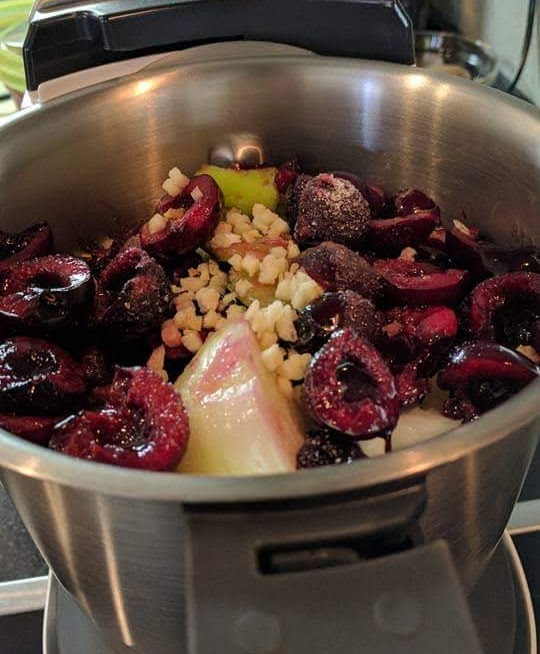 Guarnición: trocitos de jamón y de anchoas en aceite de olivaTrocea los tomates, la manzana, el pepino, la cebolla, el pimiento y el ajo. Ponlas cerezas deshuesadas en el vaso de la MC plus, todas las veeverdu troceadas, el aove, vinagre, sal y pimienta. Cierra y tritura a velocidad 6 durante 2minutos. Sube a velocidad 8, 1 minuto, y a 10 durante uno o dos minutos más