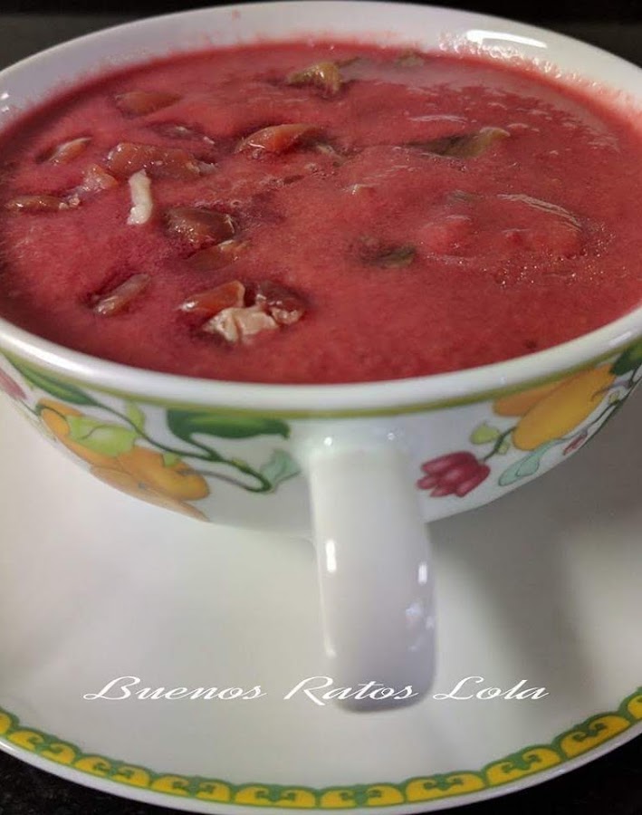 El color es precioso y el sabor sorprende a todos. Un gazpacho diferente y muy refrescante. Aprovecha que ya es temporada de cerezas.