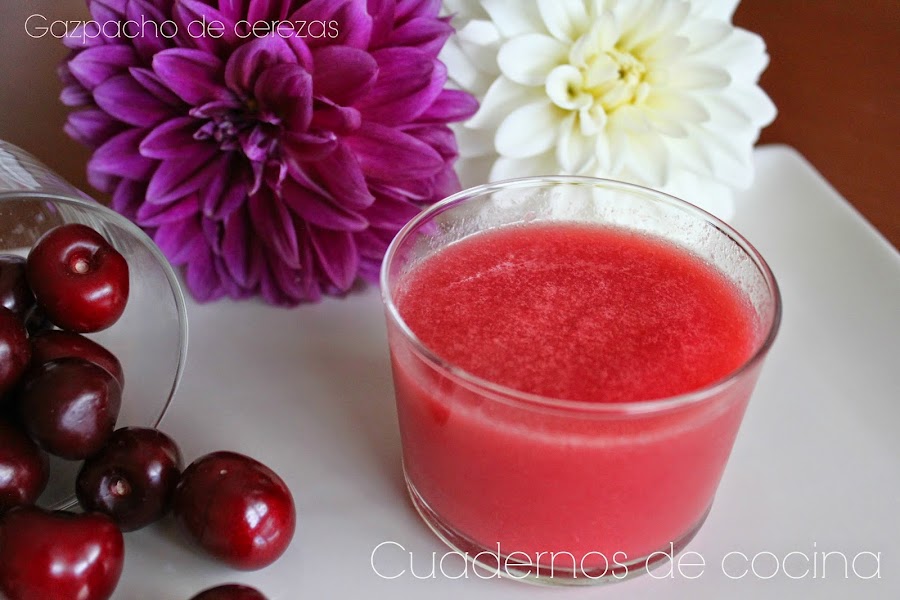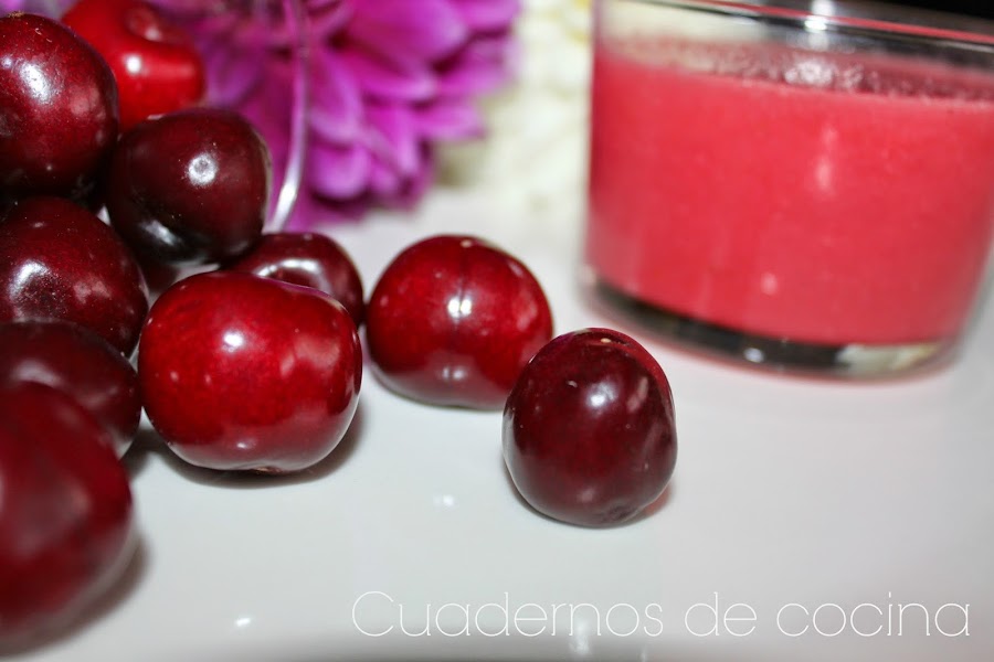 De cerezas va la cosa hoy. Pero no dulce, sino como base de un gazpacho colorido y nutritivo. Y es que la cereza es una fruta que aporta muchas vitaminas y pocas calorías, por lo que es la fruta ideal para no perder la linea. Bien fresquitas son buenas aliadas en días de calor. ¿Quién no ha empezado por un puñadito y cuando se ha querido dar cuenta tiene el plato lleno de pipos y se ve incapaz de parar? Pues sí, también son adictivas!!!!