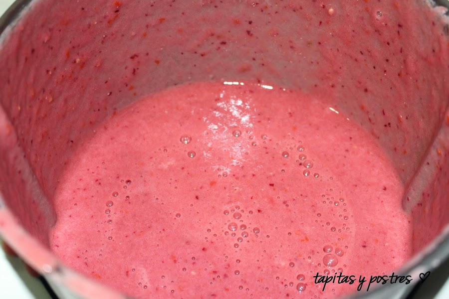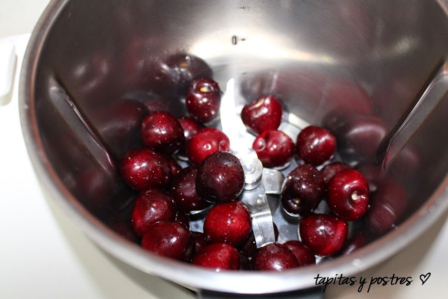 Como vamos a triturar las cerezas nos da igual que las desmenuce. Quitamos los huesos. Tened la precaución de contar las cerezas que echáis, para luego quitar el mismo número de huesos. Así evitais que se os cuele alguno.