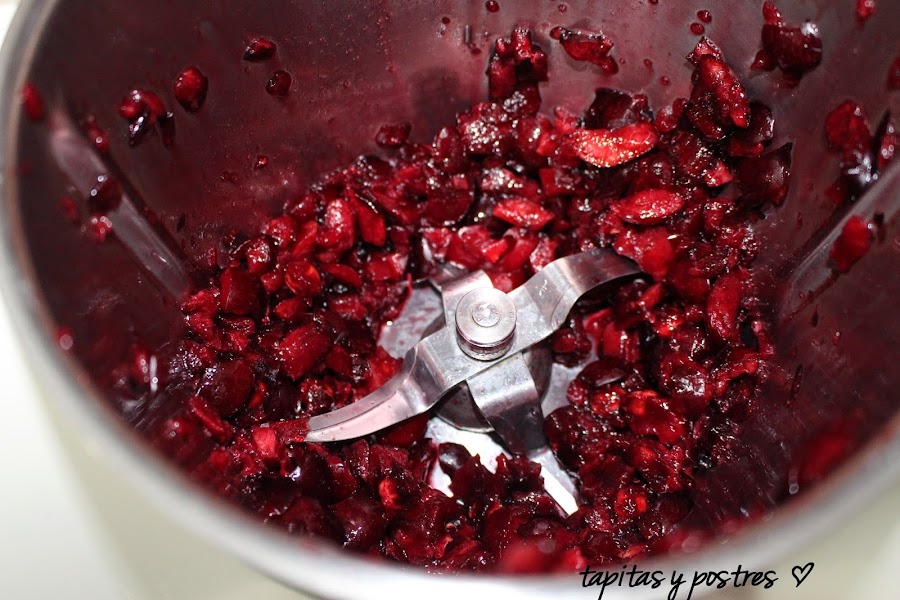Deshuesamos las cerezas, lo podemos hacer manualmente o en la thermomix. Yo he probado en thermomix 5 segundos a velocidad 4. Retiramos los huesos.